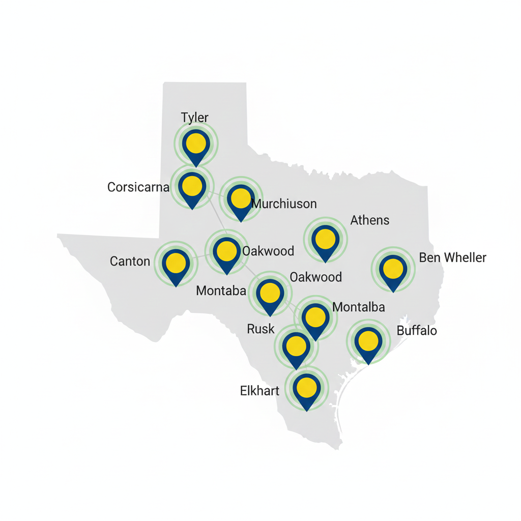 We proudly serve Tyler, Athens, Corsicana, Murchison, Rusk, Canton, Buffalo, Elkhart, Oakwood, Montalba, and Ben Wheeler, TX with top-rated pest exterminator near me services.